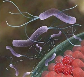 幽门螺杆菌(hp)是一种居住在人体胃黏膜上的细菌(如上图),它会分泌影响胃酸分泌的物质,破坏胃黏膜,导致某些胃部疾病的发生。